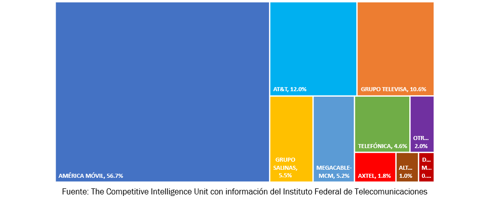 Incluso la sola participación de Telmex en términos de ingresos del mercado fijo (33.3%), considerando los mercados de telefonía, banda ancha y televisión de paga, supera significativamente la registrada por cualquiera de sus competidores.
