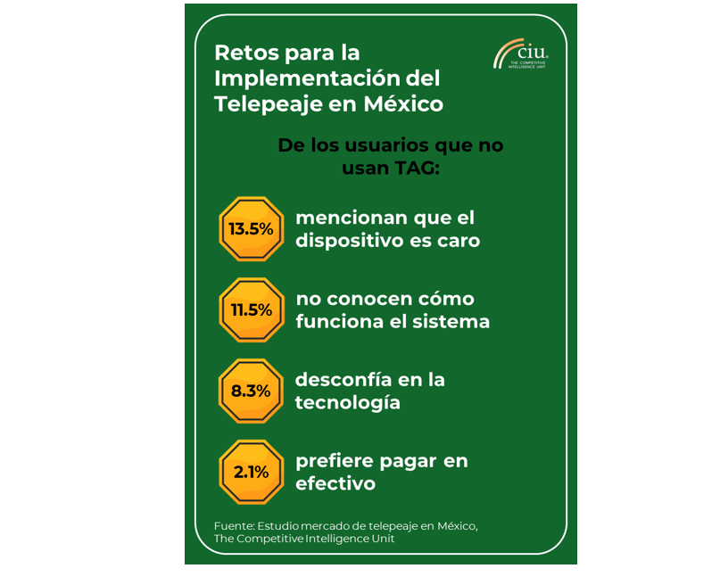 De acuerdo con el estudio “Mercado de Telepeaje en México”, elaborado por The Competitive Intelligence Unit, 13.5% de las personas que no usan TAG consideran que no lo hacen toda vez que el dispositivo es caro, lo que evidencia una percepción de poca asequibilidad económica. Además, 11.5% de los usuarios potenciales desconocen cómo funciona el sistema, lo cual habla de una brecha informativa que merma la adopción del servicio.