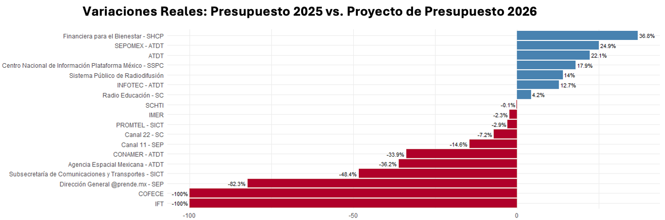 Por otro lado, se proyecta un aumento presupuestario para la Agencia de Transformación Digital y de Telecomunicaciones (ATDT), que pasa de $3.01 mil millones aprobados para 2025 a $3.85 mil millones de pesos propuestos para 2026, es decir, un aumento anual de 22.1% en términos reales.