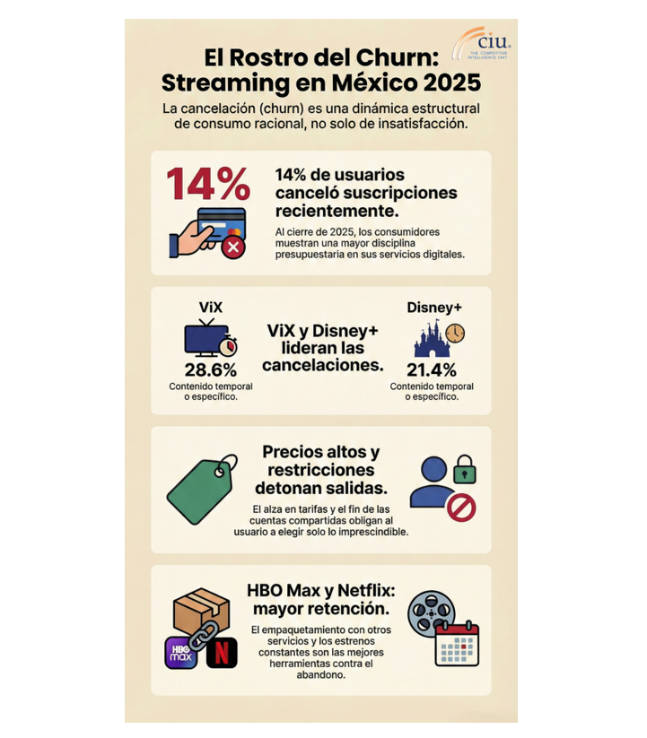 El mercado mexicano de streaming ha entrado en una fase en la que el churn es un indicador central de desempeño y seguimiento. La cancelación no es sinónimo exclusivo de insatisfacción, responde a estrategias deliberadas de racionalización del gasto y de optimización del tiempo de consumo de contenidos de los usuarios y hogares.