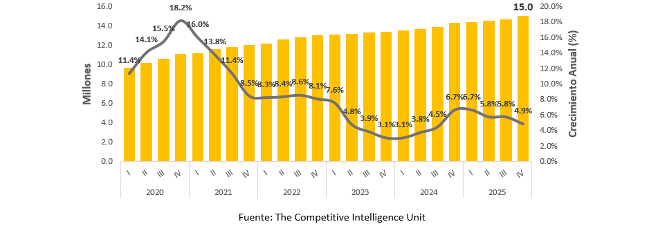 El mercado mexicano de plataformas de video bajo demanda por suscripción (SVOD) alcanzó 15.0 millones de suscripciones al cierre de 2025, un crecimiento anual de 4.9%.