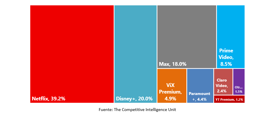 Netflix conserva el liderazgo del mercado (39.2%), mientras que Disney+ (20%) y HBO Max (18%) han fortalecido su posicionamiento competitivo.